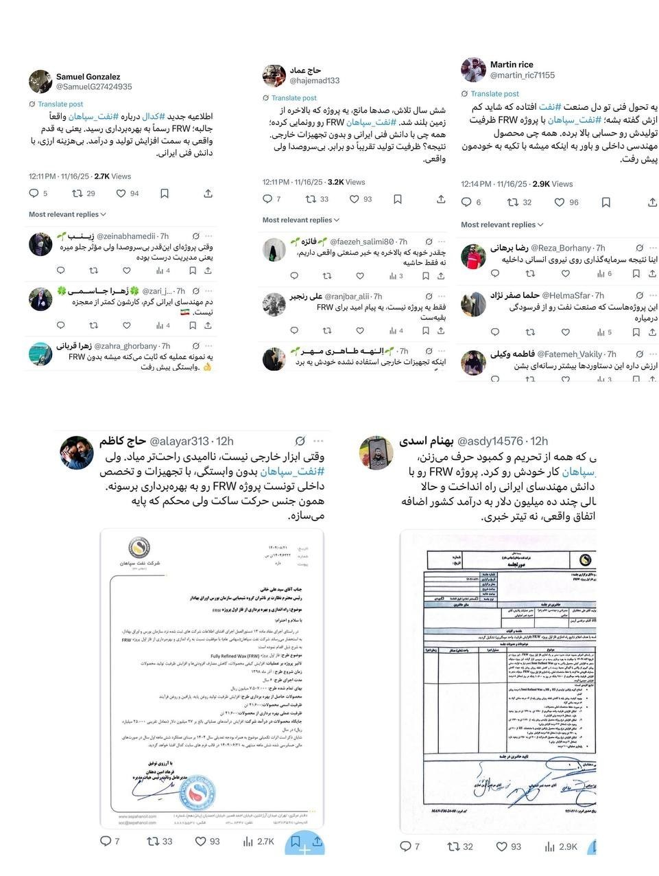 در همین زمینه، برخی از کاربران با استفاده از تصاویر و دادههای مرتبط، تلاش کردهاند اهمیت اقتصادی پروژه FRW را برای مناطق صنعتی اصفهان و اشتغال مستقیم در زنجیره تأمین نفت سپاهان نشان دهند. این واکنشها بیشتر از آنکه رنگ صنعتی یا تبلیغاتی داشته باشند، رنگ تأیید اجتماعی و ملی دارند؛ نشانهای از شکلگیری گفتمان تازه در فضای عمومی که در آن «صنعت ملی» جایگاه احساسی و هویتی پیدا میکند.
