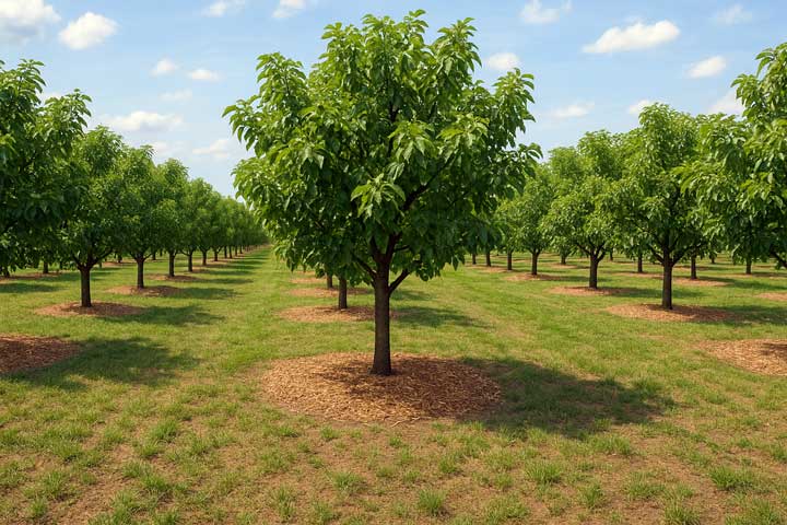 مالچ را به آرامی و یکنواخت در اطراف درختان پخش کنید. ضخامت بین ۵ تا ۸ سانتیمتر ایدهآل است. حدود ۱۰–۱۵ سانتیمتر فاصله از تنه رعایت شود و هر یک تا دو سال یک بار لایه جدید اضافه کنید تا خاک همیشه مرطوب و نرم باقی بماند.